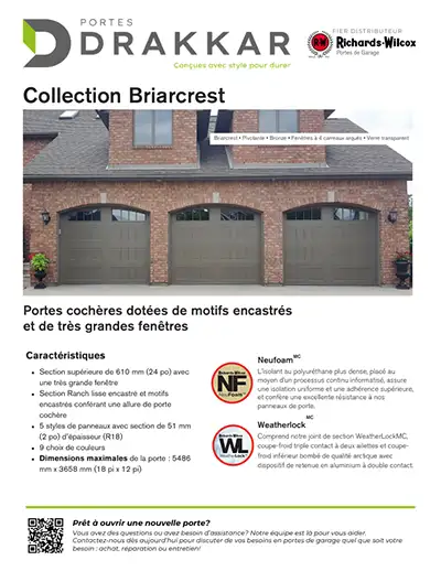 Une section supérieure de 24 po (610 mm) sublime les magnifiques options de fenêtres disponibles dans une variété de styles de panneaux porte cochère. Optez pour le charme intemporel du fer forgé ou la simplicité élégante des designs 4 carreaux sur 4, 4 carreaux ou clair, et profitez d’une vue incomparable. Alliant beauté exceptionnelle et qualité durable, les portes de garage Briarcrest feront de votre maison une résidence d’exception.